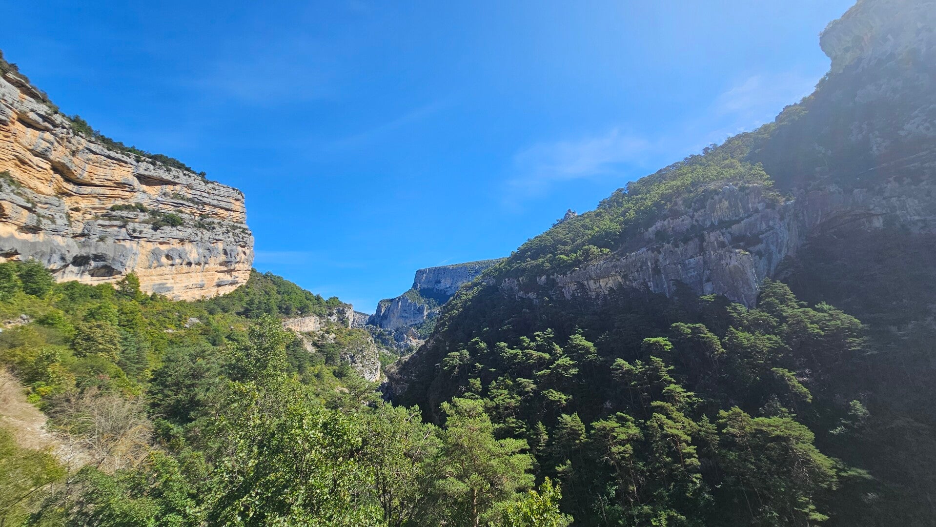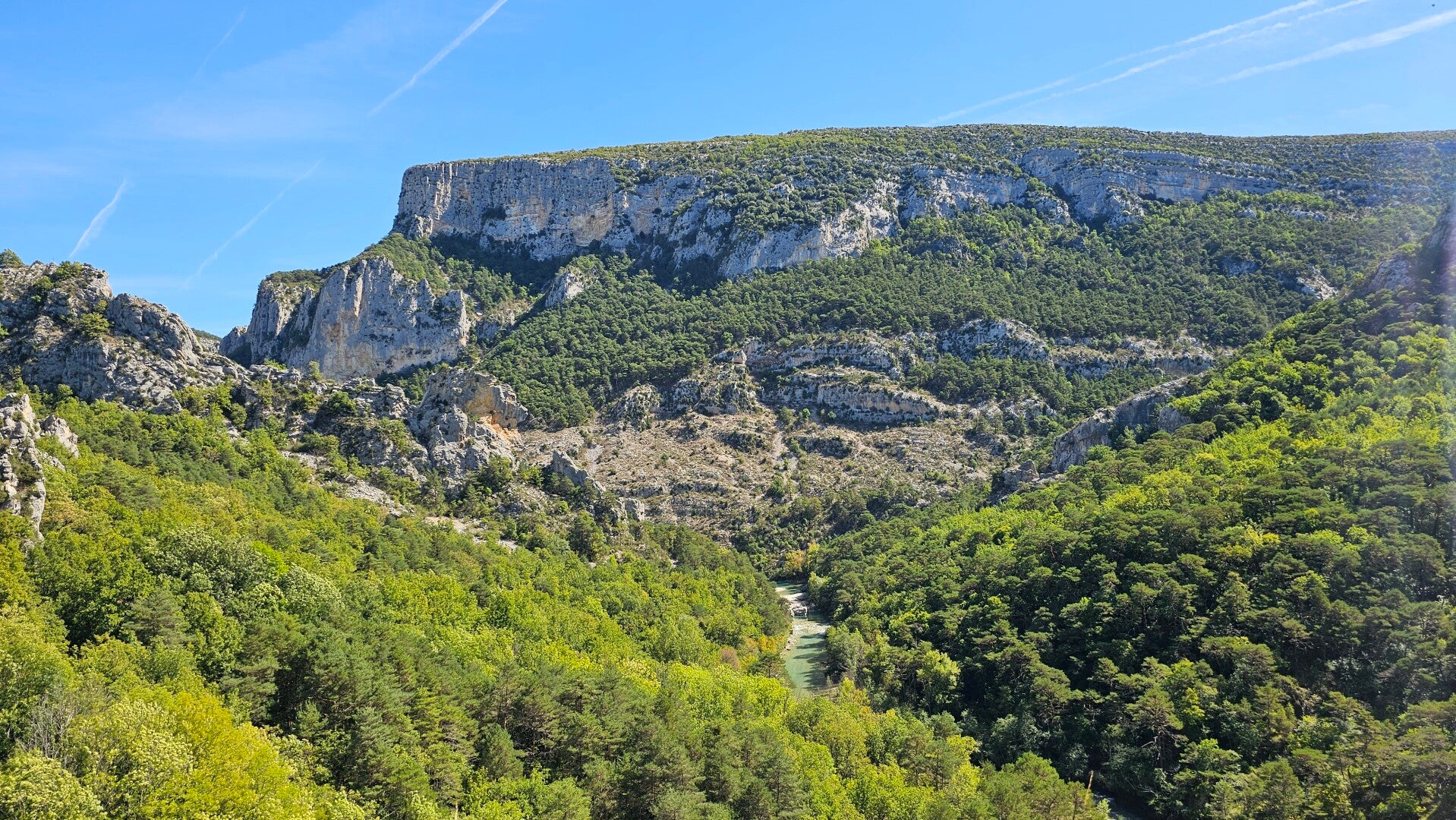 Das ist der Fluss Verdon, der sich durch die Felsen schlängelt.