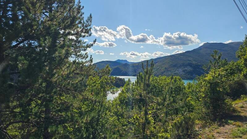 Wir sind gerade ein paar Minuten unterwegs, da haben wir schon einen superschönen Blick auf den Lac de Sainte Croix. Er ist der viertgrößte Stausee in Frankreich. Der Hauptzufluss Verdon duchfließt zunächst eine der tiefsten Schluchten Europas, die Verdonschlucht, bevor er an deren westlichen Ende unmittelbar in den See fließt.